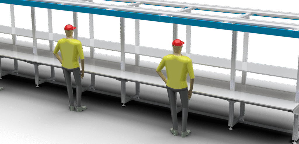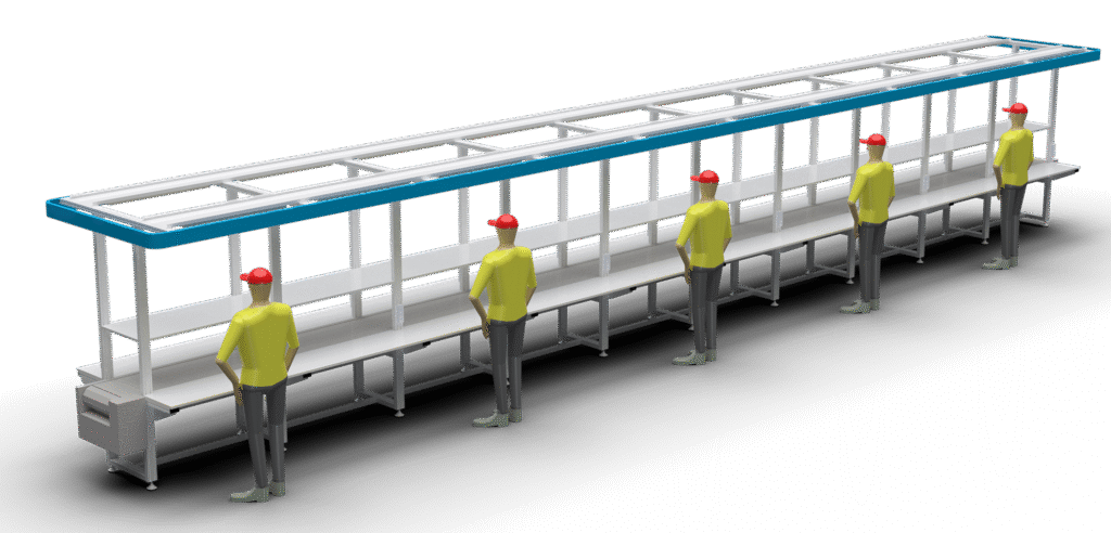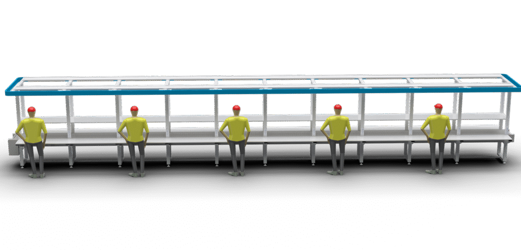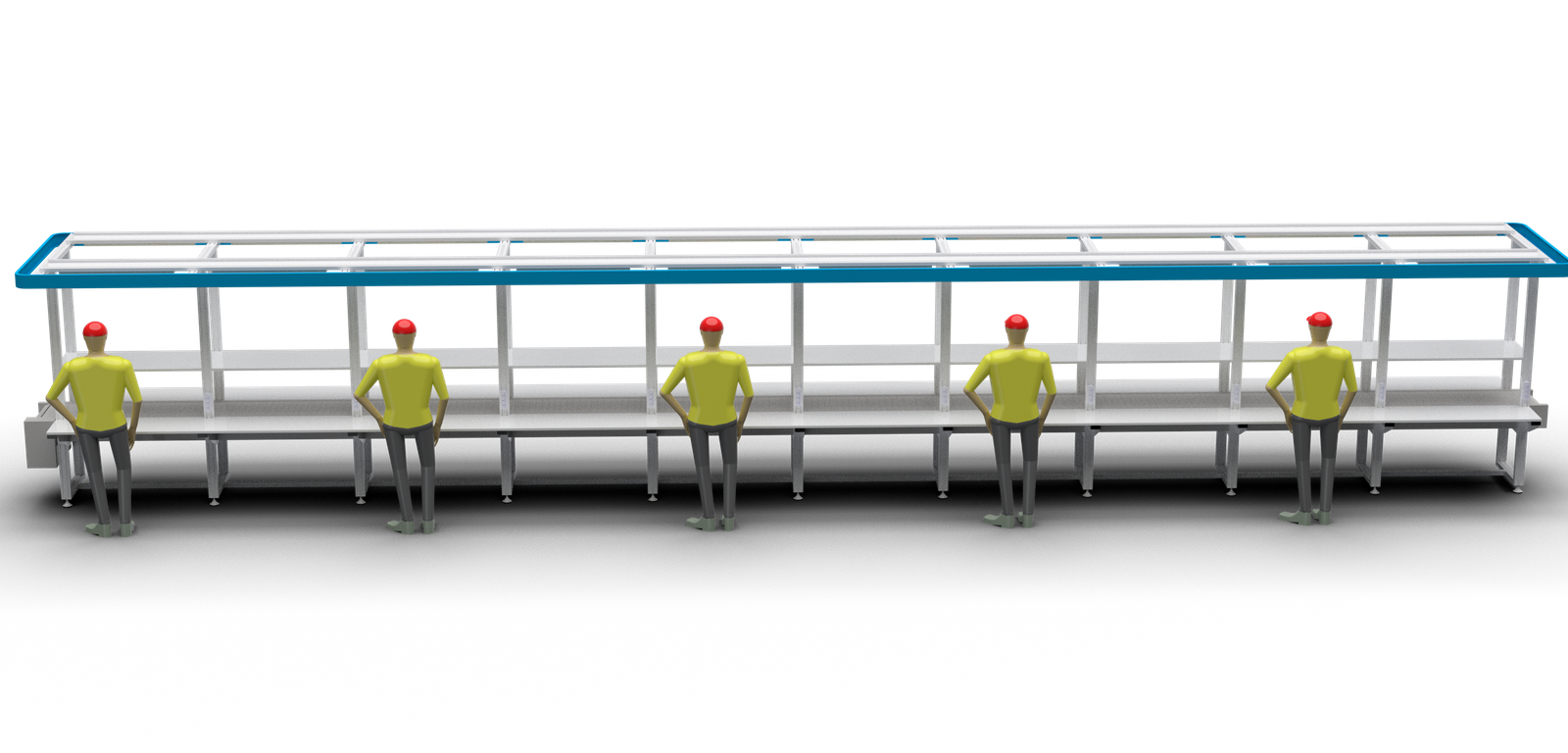 - Two-tier layout: upper tier for assembly, lower tier for empty-pallet return.